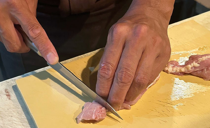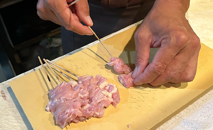 You will skewer pre-cut chicken and vegetables. While this may seem simple, it actually requires skill. The way skewering is done significantly impacts the final appearance and texture of the grilled meat. Don’t worry—our staff will guide you every step of the way.